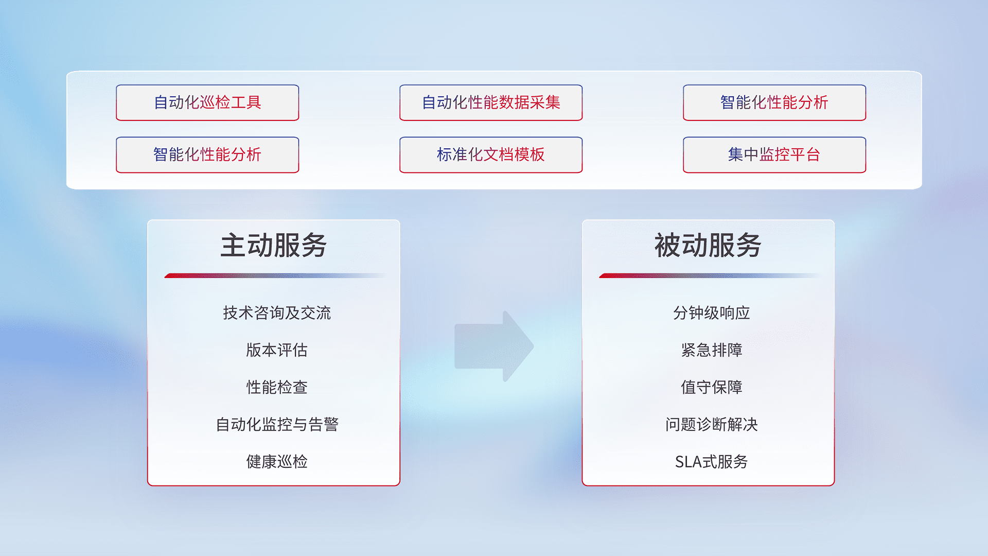 智能化工具和标准化文档,,保障服务质量,,提供主动服务(包含技术咨询、、、、版本评估、、、性能检查、、自动化监控与告警、、、健康巡检)和被动服务包含(分钟级响应、、、、紧急排障、、、、值守保障、、问题诊断解决、、、、SLA服务)。。。