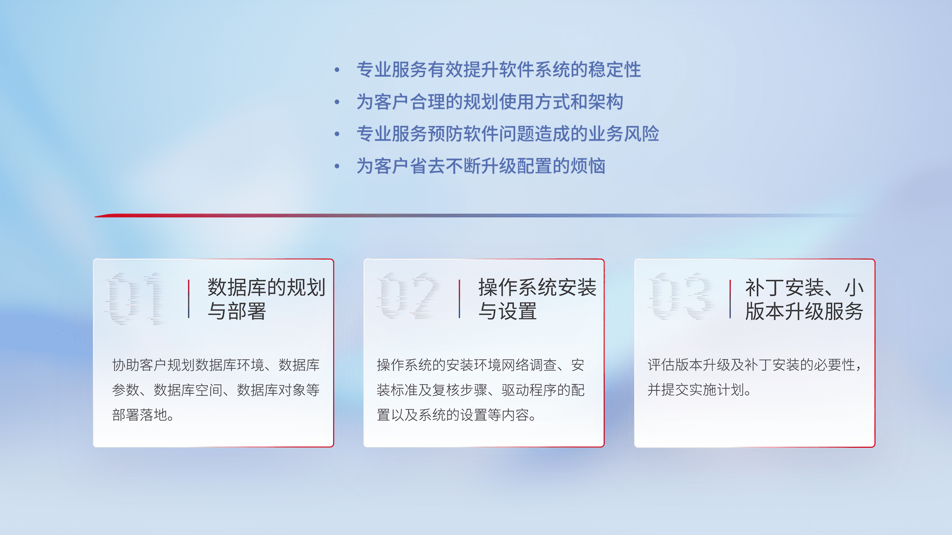 为客户提供软件规模升级、、、、快速部署、、、、按需配置的专业服务,,从数据库的规划与部署到操作系统的安装与设置,,再到补丁安装和小版本升级提供支持。。。